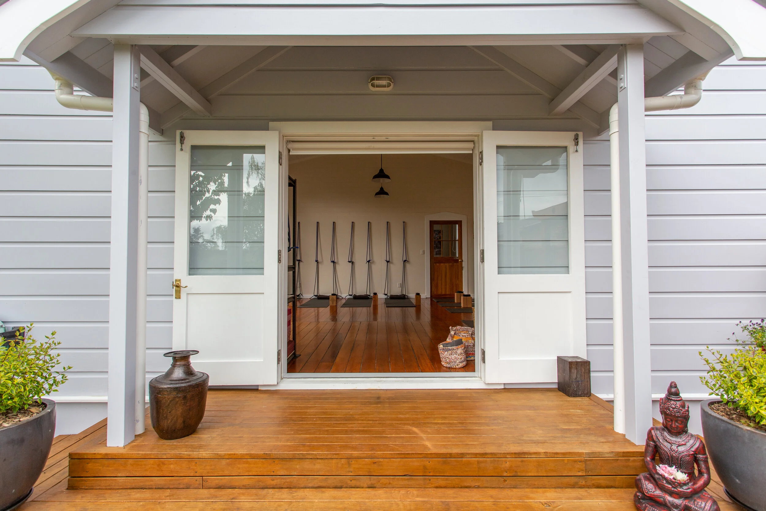 Nestled in a garden that marries East and West, our private studio is the original Te Whiti schoolhouse. It is a sun-drenched sanctuary with high ceilings, matai flooring and large windows looking out to a lovely garden infused with birdsong and bees. It oozes light, space, peace, harmony and joy.